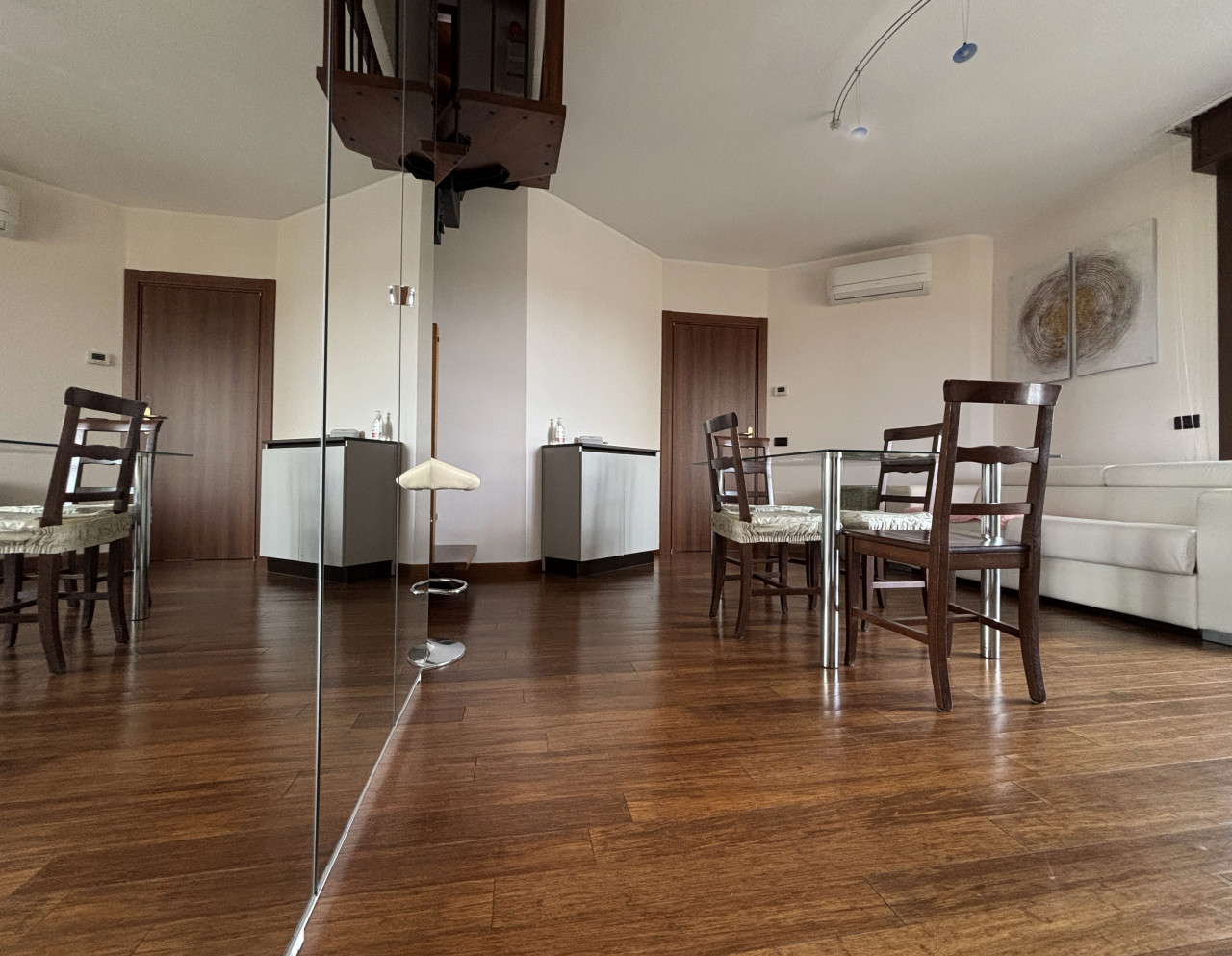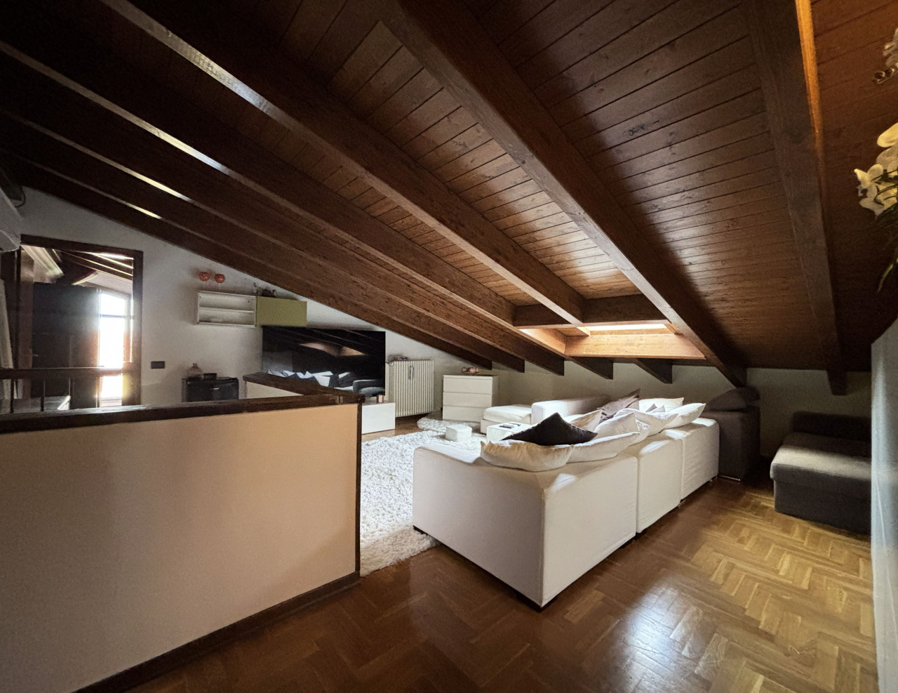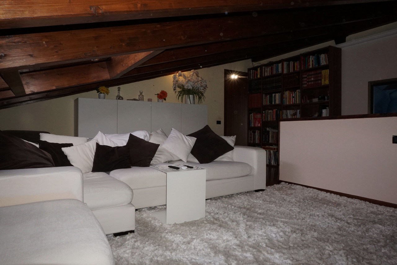 Una elegante scala in legno conduce al piano mansardato dove vi attende una seconda area living riservata ed intima, perfetta come studio o sala hobby; qui è presente anche la camera matrimoniale padronale progettata per ottimizzare ogni spazio disponibile, insieme ad un secondo grande bagno completo di vasca.