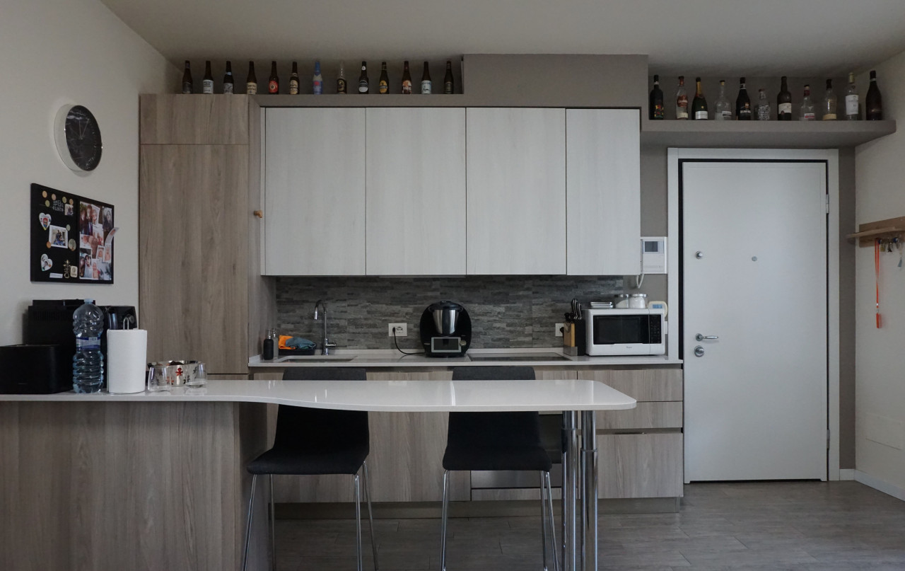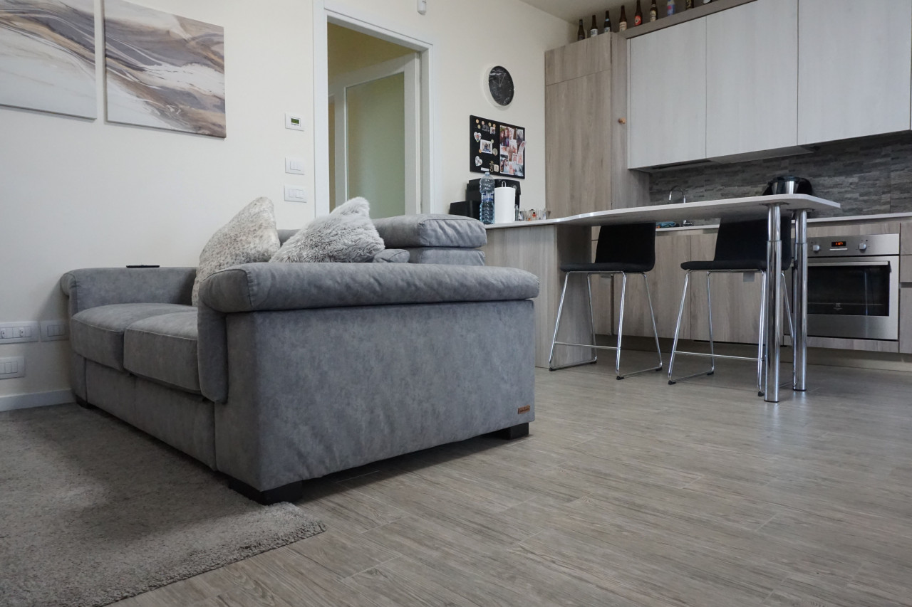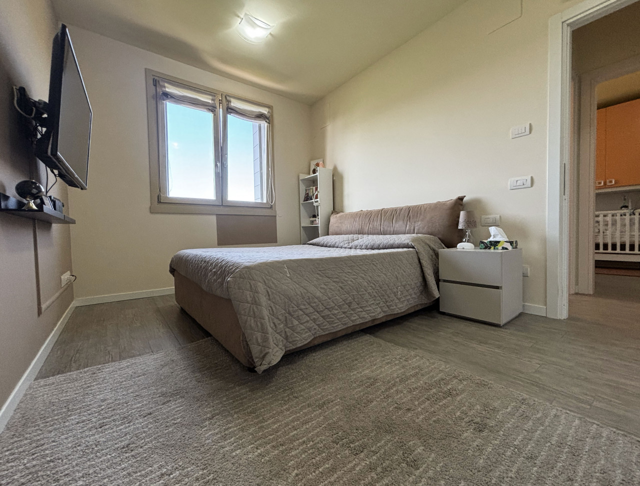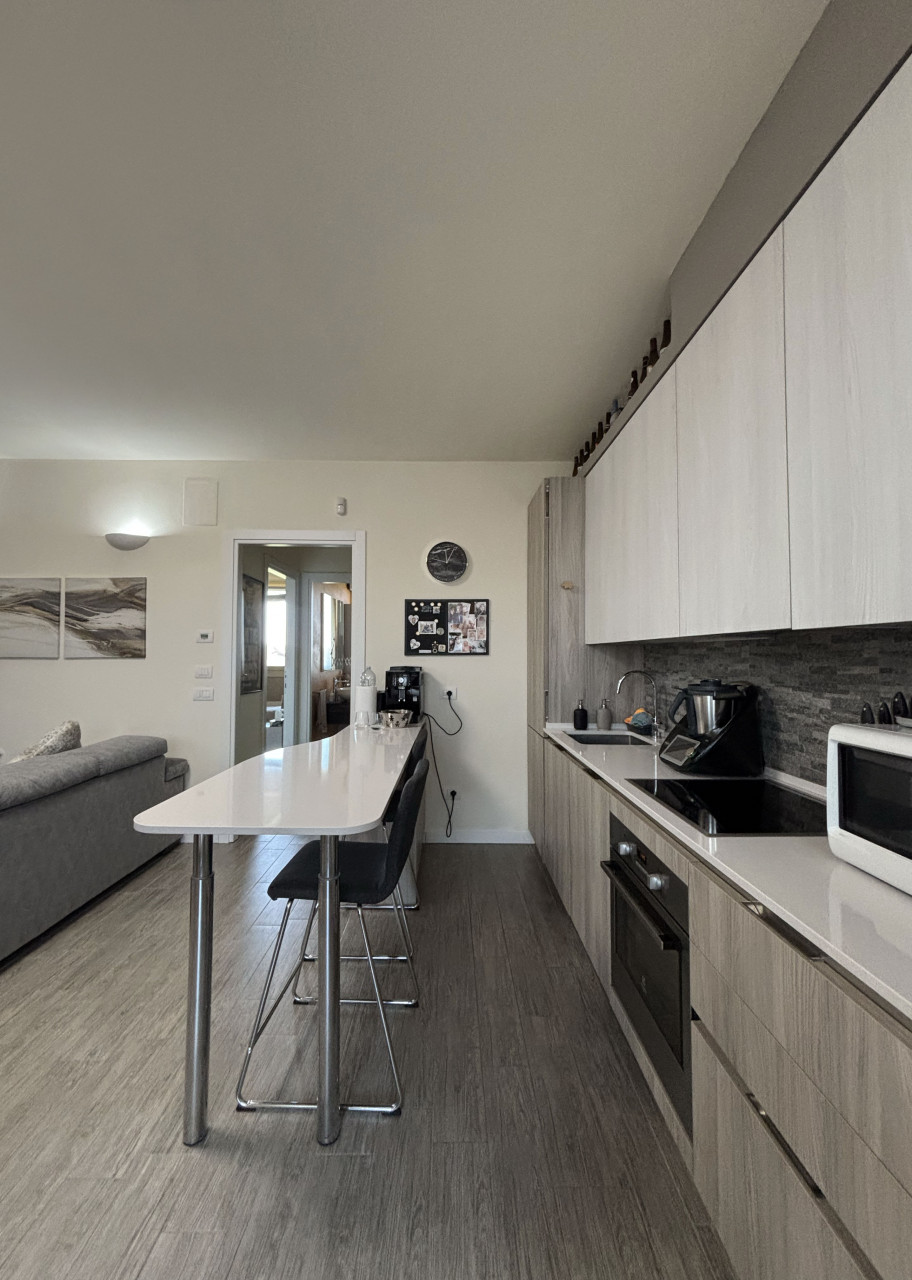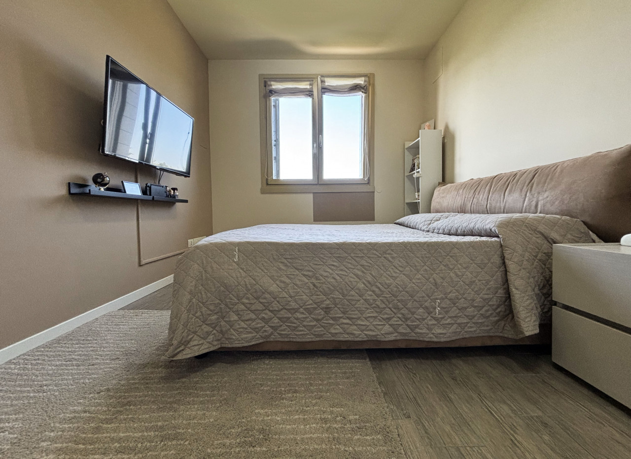 L’appartamento offre un ampio soggiorno luminoso con cucina a vista che si affaccia su una loggia attrezzata. Questa loggia è dotata di chiusura metà vetrata e metà zanzariera, perfetta per godere dei momenti all’aperto senza rinunciare al comfort interno.