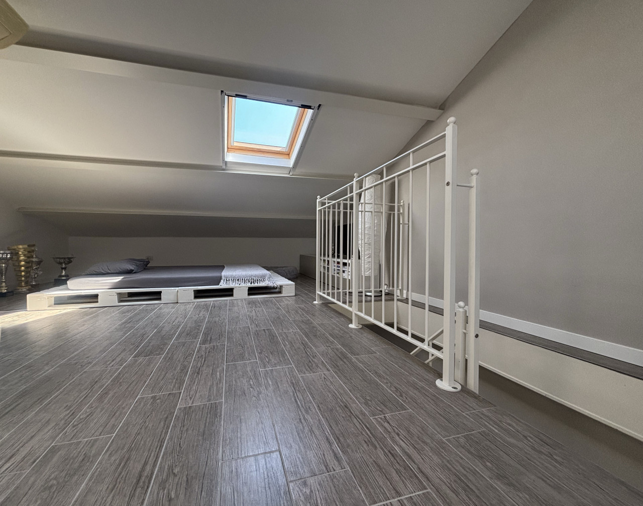 Una scala interna conduce al piano superiore mansardato dove troverai uno spazio versatile adibito a studio/camera e un servizio aggiuntivo. La zona notte comprende una camera matrimoniale accogliente, completata da un bagno moderno con doccia e una camera singola ideale per bambini o come stanza degli ospiti.