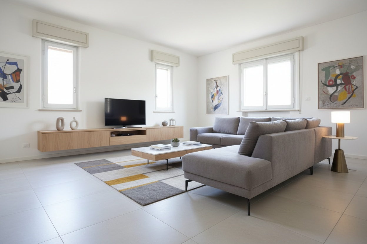 L’immobile presenta una pianta quadrata libera su tutti i lati che garantisce luminosità e fluidità negli spazi interni. L’ingresso è spazioso ed accogliente, conducendo ad un ampio soggiorno con area pranzo integrata perfetto per conviviali momenti in famiglia o tra amici. La cucina, sebbene compatta, è funzionale e ben attrezzata.